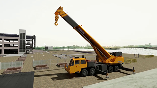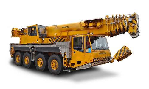 Vertex Mobile Crane with the necessary equipment to travel at speed on public roads, and on rough terrain at the job site using all-wheel and crab steering. This crane is mounted on an undercarriage with four rubber tires that is designed for pick- and-carry operations and for off-road and "rough terrain" applications. Outriggers are used to level and stabilize the crane for hoisting. In a rough terrain crane, the engine is usually mounted in the undercarriage rather than in the upper, as with crawler crane. Most models have 4-wheel drive and 4 wheel steering which allows them to traverse tighter and slicker terrain than a standard truck crane with less site prep.