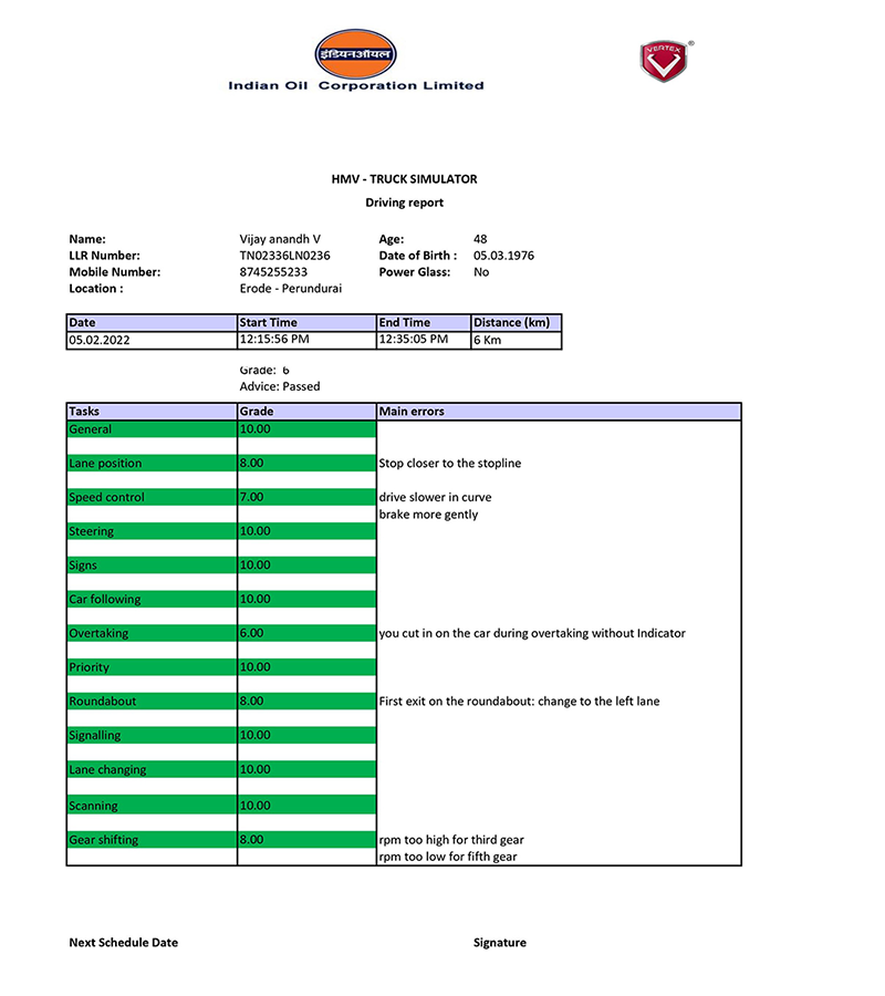 Vertex provides effective training modules following the CMVR Rules like Vehicle Controls, Pre-Driving Checks, Holding Steering Wheel, Gear Changing, Beginning to Drive, Manoeuvres, Slopping, Stopping Distance, Following Distance, Defensive Driving Techniques, Night Driving, Hill Driving, Emergency manoeuvres, Special circumstance, Driving Impairments, Echo Driving and Evaluation test. For other Countries we Follow International Standards on their country regulations.
